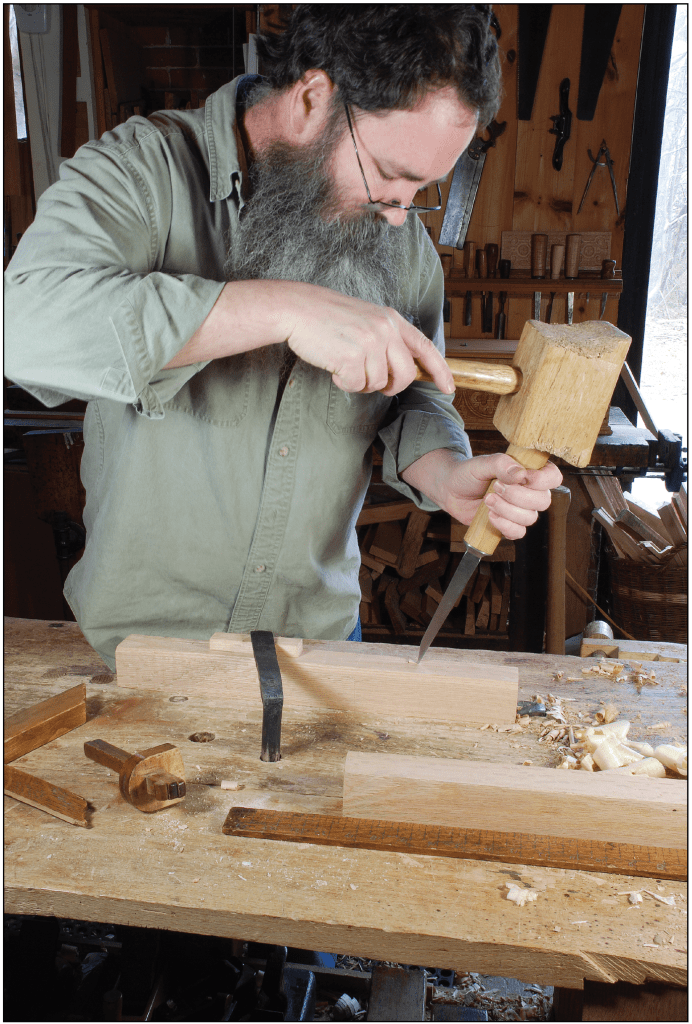stile in one hand. The thumb on the chisel’s blade and the fingers below the stile keep the tool in place
