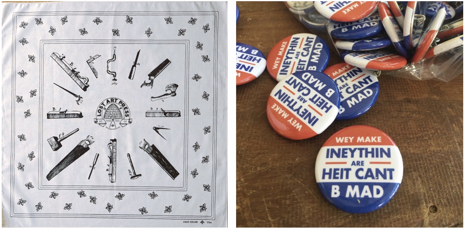I will select the winner and the two-pronged prize is a Lost Art Press bandana and a Chester Cornett button (pictured below) and Chris Schwarz will send these anywhere in the world.