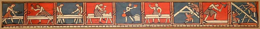 The artists responsible for painting the ceilings and crossbeams of Tereul Cathedral included the central figure offering liquid refreshment to the carpenters, with ready acceptance by the one on the right.