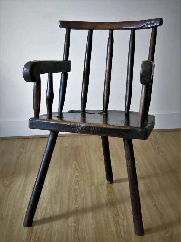 Rudy: This is the information provided: “Attractive three-legged armchair of primitive form, constructed from various native woods in oak, ash and pine. With an exceptionally good seat height of 18” for this vernacular piece. Striking colour with a rich, naturally aged patination. Owners initials T.P., with the letter H also incised into the seat of the chair. A simple understated primitive piece of furniture.