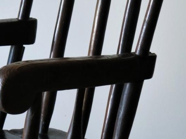 Sorry, I’m a little late to the chair chat party. Arms look like recycled gunstocks to me, and the sticks look like a bunch of rolling pins or legs turned into sticks? Maybe this maker was a thief, grabbed what he/she could in a hurry from a chair makers shop, and built the chair after drinking way too much, hence the odd orientation of the arms, the big chip on the seat, and that probing thing there. I also think he/she put the seat upside down because of the initials location. Anyway, that was a good chat boys. Thanks!