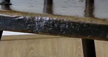 Chris: On the sitting part. Not the edge. Maybe this chair was stored someplace where it rubbed on rocks? Or there was some work performed between the sitter’s legs? And that marked the front edge?