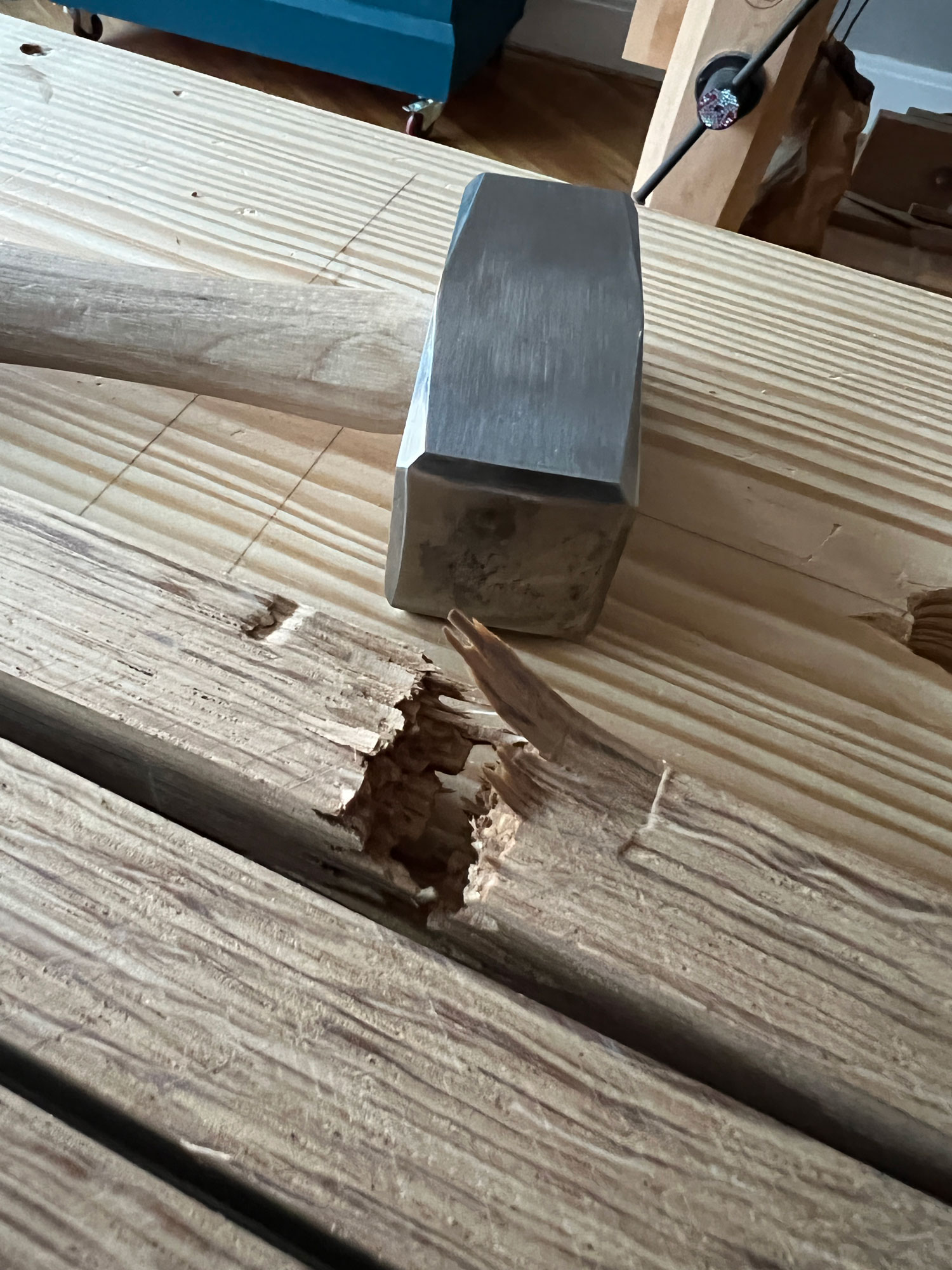 The results can be comical. Some woods are almost indestructible – a 1/2”-diameter x 26” straight-grain ash stick will bounce the mallet right back into your face. And I’ve been able to break 3” x 3” x 24″ sticks of brash red oak like they were Twix candy bars.