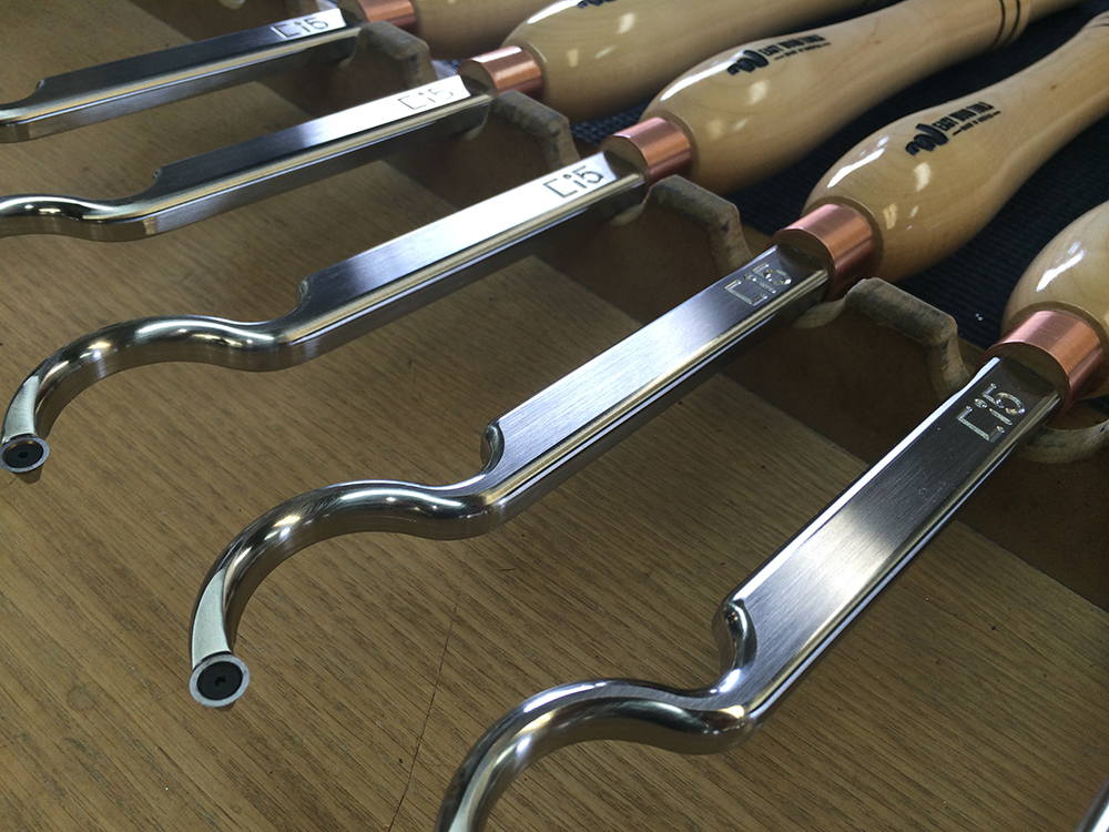 So Craig started playing around with carbide inserts. Unable to find anything he liked, he engineered his own replaceable carbide inserts (eliminating the need to constantly resharpen) with crazy angles. He then designed tools with stainless steel to hold the carbide inserts and wooden (mostly maple) handles.