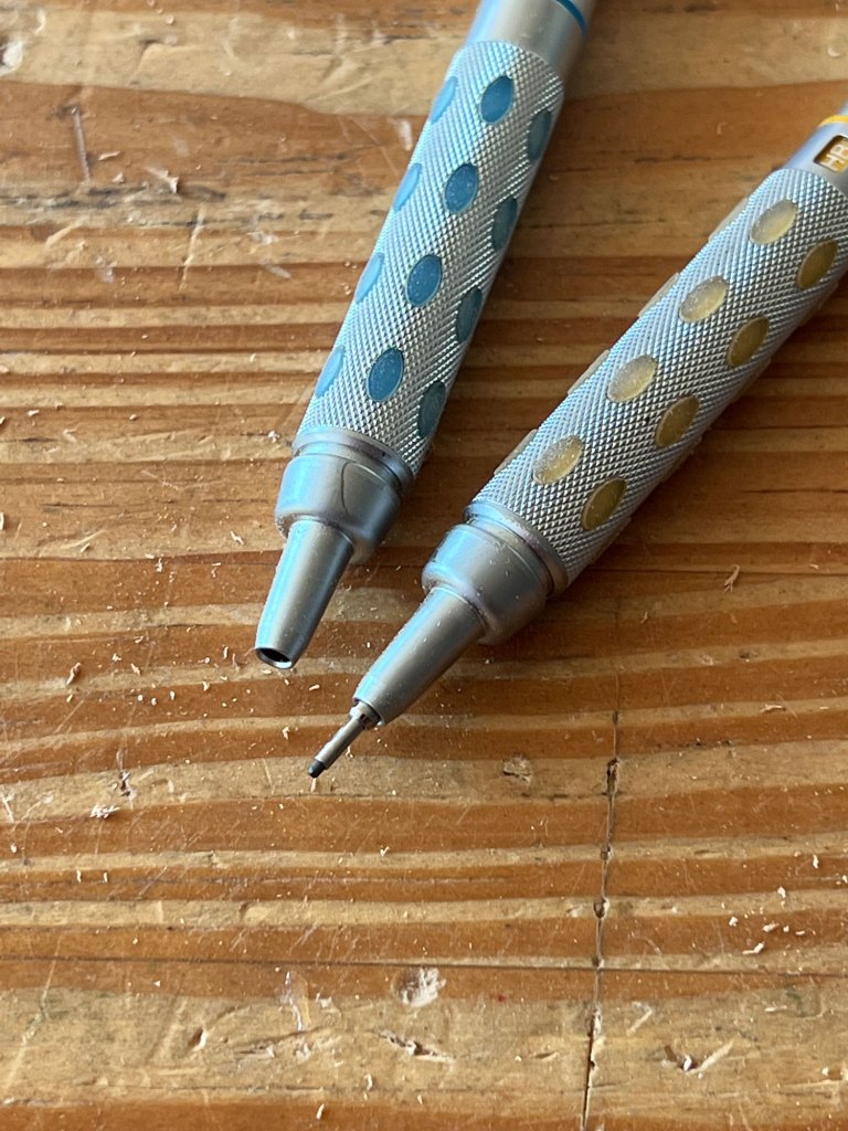 I’ve been using Rotring (red ring) all metal pens and pencils for 30 years in 0.7 mm for writing on paper and 2 mm for writing on wood. Love them both. I used to use .5 mm but found I break the leads too frequently by pressing down to hard and the .7 mm is thin enough.