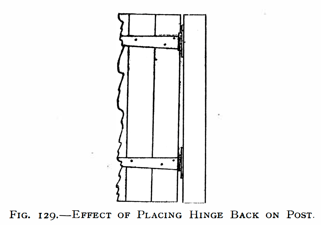 For ledge doors the usual hinges are the “cross garnett ” or “tee” hinges, examples of which are given in Fig. 127. The fixing of these is very simple: the door is stood up in position, blocking it so that it has the correct play all round, and the hinges screwed on as in Fig. 128. The top hinge should have the knuckle immediately over the joint, but the bottom should be placed back further on to the post as shown. This has the effect of throwing the front of the door up as it opens, as shown in Fig. 129.