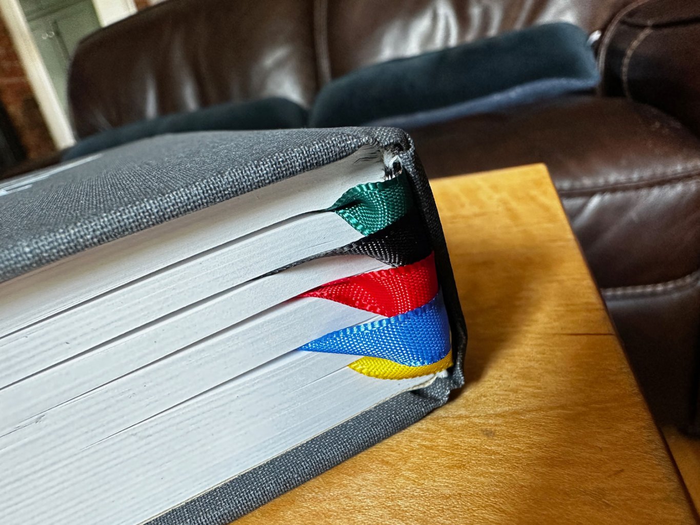One of the many reasons I read this blog daily is for the new knowledge gleaned. Bible bookmarks, brilliant. I’ve been making my own bookmarks for years. Be it card stock, run thru the laminator, then trimmed. To the actual receipt, as mentioned earlier. To a simple as a 3×5 or 4×6 index card for writing notes ( I stilll have a hard time practicing marginalia in my books).