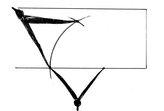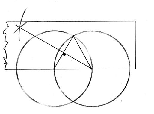 Let’s break it down into smaller pieces. We begin with Euclid’s first proposition, which is how to construct an equilateral triangle from a given line. Start by using the ends of a line to set the compass span and, using the end of the line as anchor points, draw two identical overlapping circles. Connect the top intersection where the circles overlap. Take note that the lines that connect the intersections also happen to share the radius of both circles. You just created a triangle with all sides equal which means all three corners are 60°, Fig. 7.17.