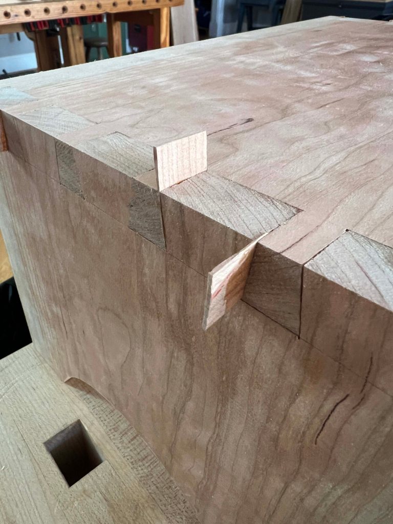 I’ll start with my least favorite, which is gluing in wedges/shims. If your pins and tails aren’t at least a little bit proud (that is, they stick out beyond the mating surface), gluing a shim into the gap is pretty much the best way I know to hide it. And it is always, in my opinion, the best way to hide a gaping maw.