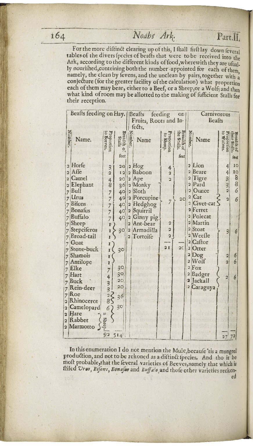 The Bishop, a most sincere and helpful man, also made a scientific table to help classify and separate the animals by species and body proportion: Beasts feeding on hay, Beasts feeding on insects, Carnivorous Beasts. If an animal is a “mungrel”, such as a mule, they are left out. Crocodiles, seals, turtles get to fend for themselves as, “…such kind of Animals as can abide in the water to their own devises.”